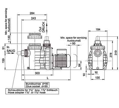 Schwimmbadwasser-Umwälzung in kleineren bis mittleren Pool Filteranlagen, aufstellbar max. 2 m oberhalb oder max. 3 m unterhalb des Wasserniveaus.