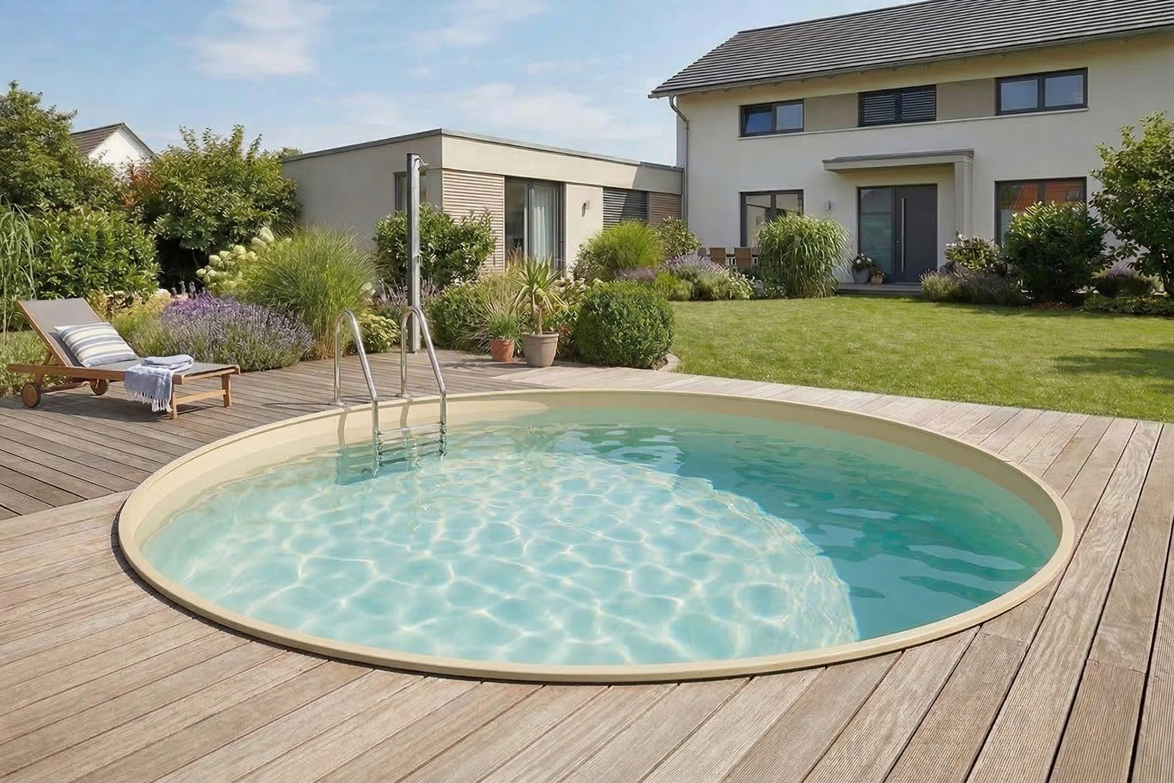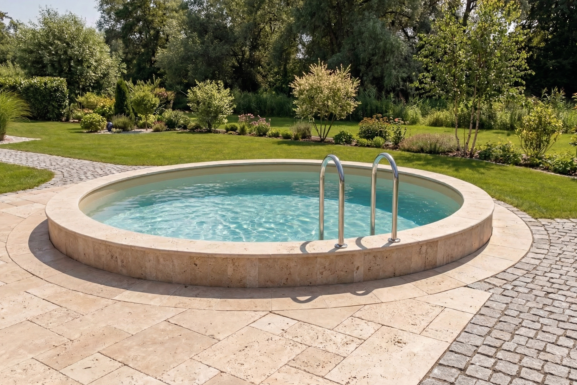 Warm-beiger Ton – erinnert an Strand- oder Naturpools. Ideal für mediterrane Gärten.