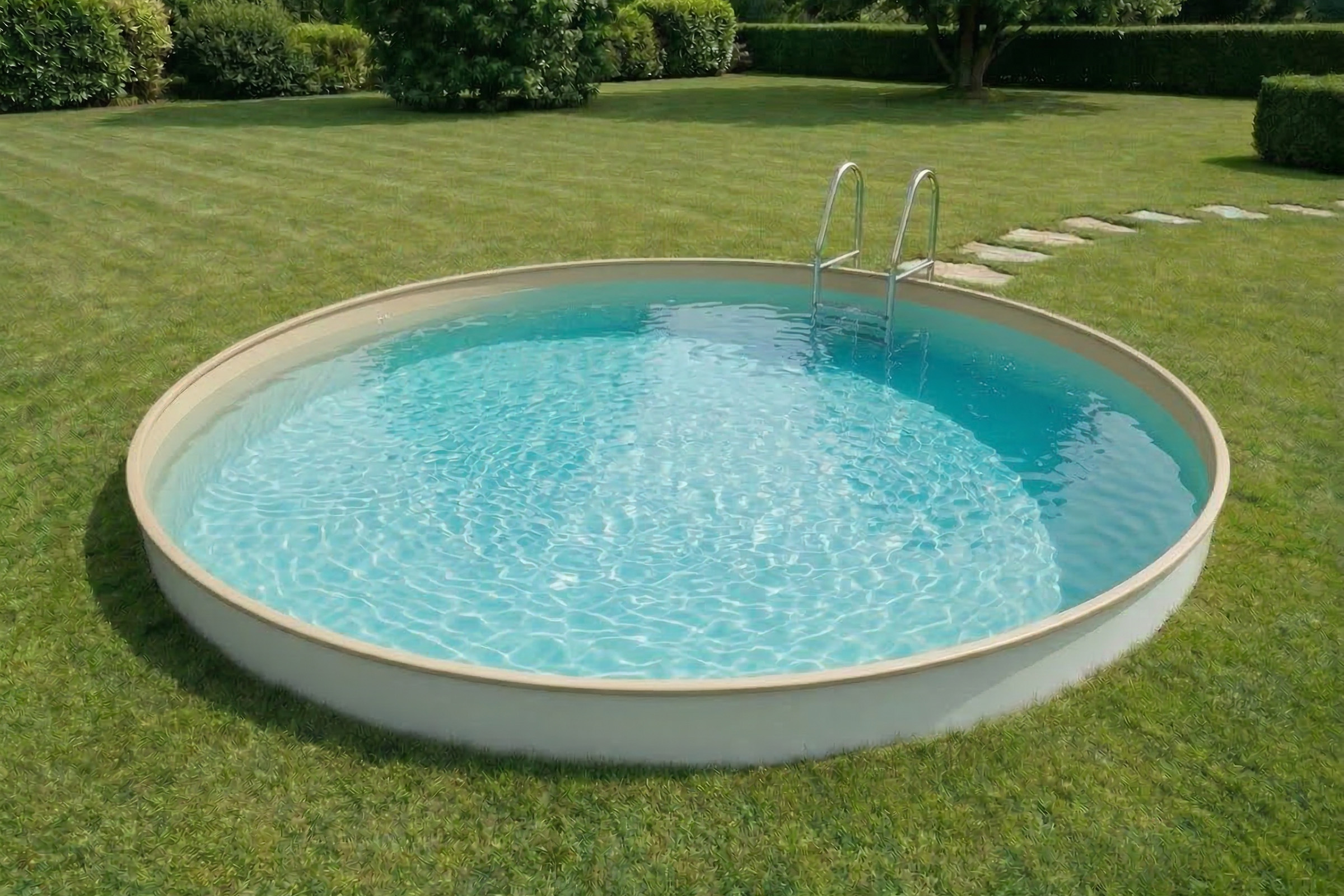 Für ein natürliches, modernes Wasserbild empfehlen wir Grau oder Sand. Das Wasser wirkt dabei dunkel-edel bzw. warm-beige – ähnlich einem Natursee oder Strandpool. Dunkelblau ergibt ein intensives, sattes Blau. Hellblau erzeugt ein türkises Flair. Letztlich ist es Geschmackssache – die Farbbeispiele findest du weiter oben. Für den Rundpool stehen vier Farben zur Auswahl: Dunkelblau, Hellblau, Grau und Sand.